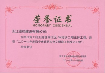 王庭世家2016年度標(biāo)準(zhǔn)化工地榮譽(yù)證書