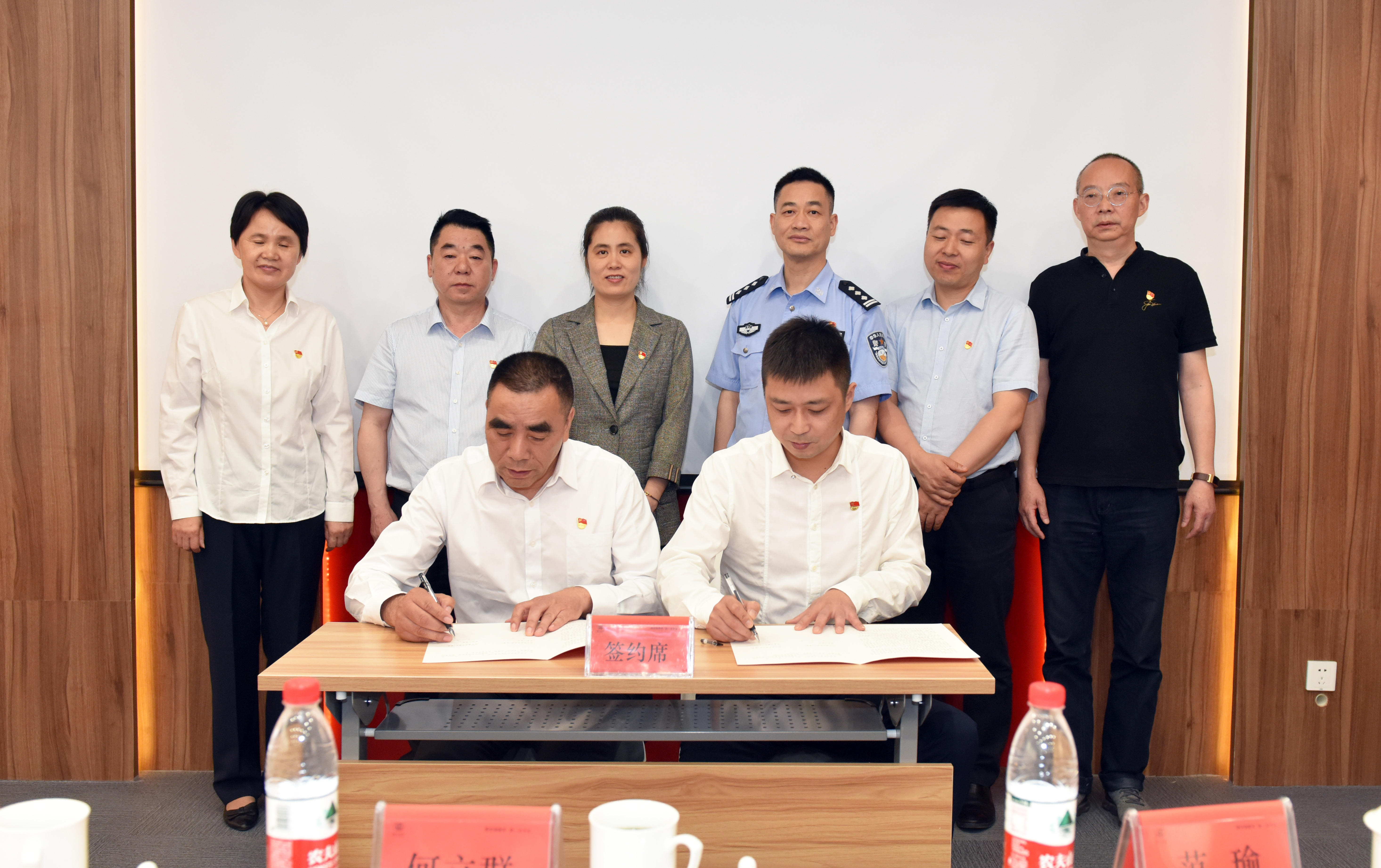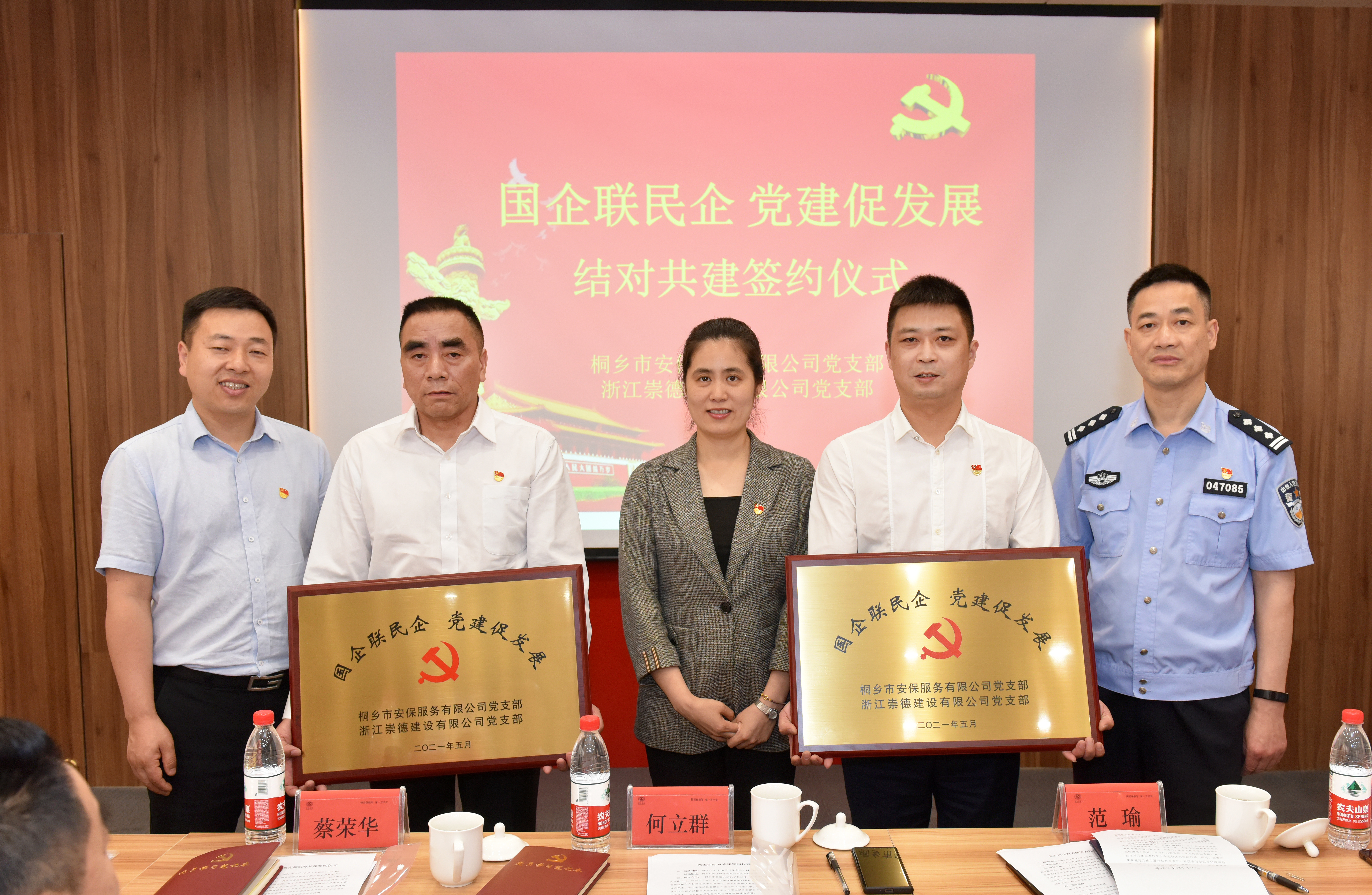 在全體與會人員的共同見證下,桐鄉(xiāng)市安保服務(wù)有限公司黨支部書記商偉杰、浙江崇德建設(shè)有限公司黨支部書記柴永根簽署《黨組織結(jié)對共建協(xié)議書》,互贈共建單位銅牌,雙方正式達(dá)成“國企聯(lián)民企 黨建促發(fā)展”的共建共識。